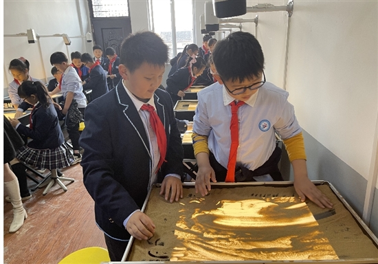 抓一把沙子,从手心缓缓地漏下,再用大拇指慢慢推开,山丘、河流、草地的轮廓渐渐清晰……新河小学五年级的学生正在老师的指导下拨沙成画;隔壁的尤克里里教室,四年级的学生弹奏出一曲又一曲美妙的音乐;楼上的“中医馆”,学生跟老师认识穴位,学习简单的按摩手法……