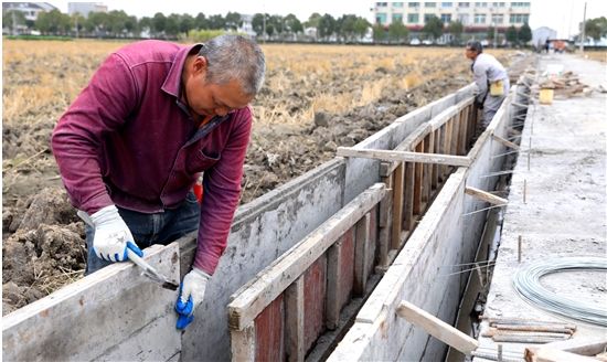 12月25日,在新河镇蔡洋村,施工人员正在给混凝土沟渠固定木板。