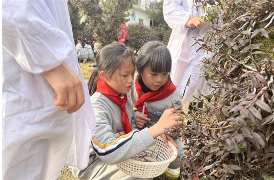 种植园里,一棵棵枣树被裹上岩苔、树苔,一丛丛石斛被黑网带绑在树上,白色的根须深深地扎进了树皮。“石斛和枣树是寄生关系吗?”“它的生长对枣树有影响吗?”“树上长出的石斛和地里种的石斛有什么区别?”面对长相奇特的“石斛树”,学生们全变成了“好奇宝宝”,摘一摘、摸一摸、闻一闻。听着工作人员的讲解,学生们不禁发出惊叹。他们走着、看着、思考着,把所见所闻认真地记在学习单上。