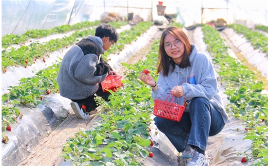 新春将至,草莓进入成熟期。1月12日,在滨海镇老五农庄的草莓采摘棚里,市民正在采摘草莓,欣赏田园风光。