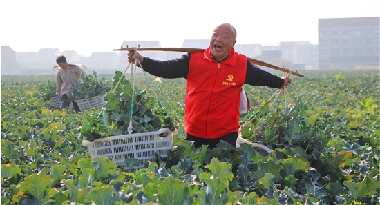 近年来,箬横镇通过“党建帮带”模式,发展有“致富花”美誉的西蓝花等农村特色产业,助力乡村共同富裕。图为该镇党员志愿者来到高楼村百亩西蓝花种植基地,帮助农户抢收西蓝花。