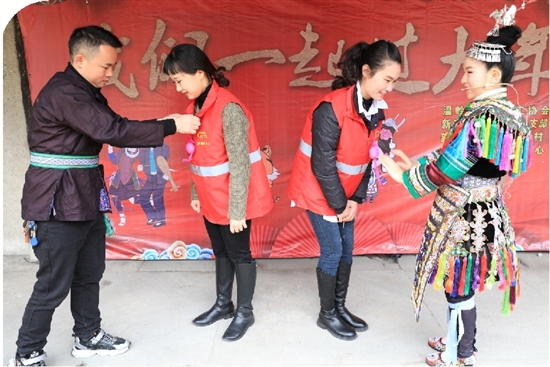 “这是我用糯米酿的甜酒,在我们侗族,客人来了都要喝一碗这样的‘拦门酒’。而挂红鸡蛋,是向客人表达新年的美好祝福,意寓‘新年红红火火’。”吴美云向志愿者们介绍起了侗族文化。