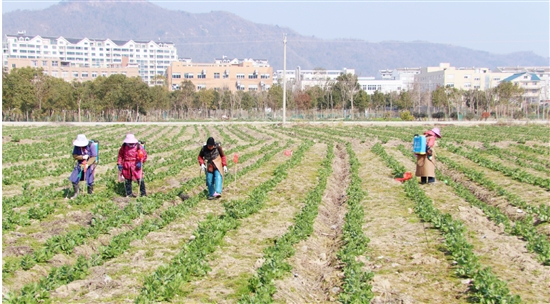 近日,记者在石桥头镇下宅金村的蚕豆种植地里看到,青翠蚕豆苗在清风中摇摆,长势喜人,当地不少种植户穿梭其间,或施肥,或浇水,或除草。