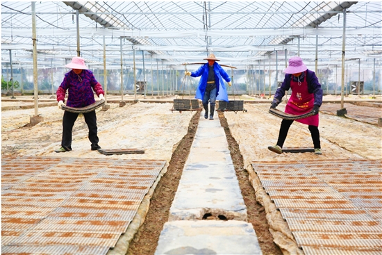 2月11日,市国聪育供秧服务中心,种植户们在大棚里码放水稻育苗盘。