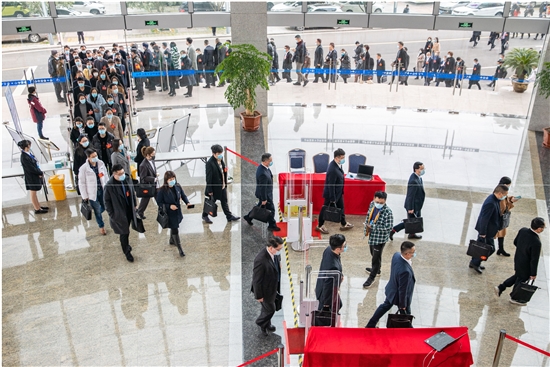 报到现场秩序井然,防疫工作一丝不苟,委员们佩戴口罩在工作人员的指引下核验行程卡和健康码。为确保大会安全有序进行,会议期间,委员驻点酒店实行闭环管理,驻地与会场之间点对点接送,时刻绷紧疫情防控这根弦。