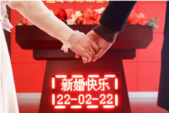 2月22日,恰好又是农历正月廿二,星期二,一个被网友称为“2000年来最有‘爱’的日子”。我市许多情侣选择在这一天到市行政服务中心婚姻登记处办理婚姻登记手续,领取结婚证,希望爱情可以长长久久。