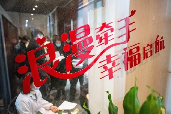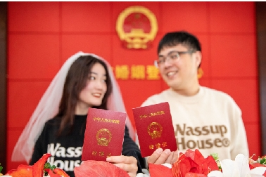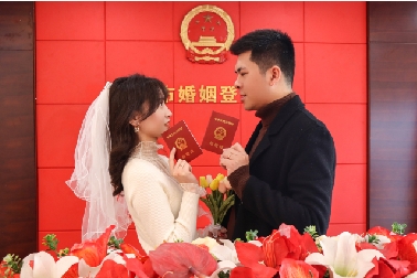 ◀情侣们选择在这一天办理婚姻登记手续,领取结婚证,希望爱情可以长长久久。