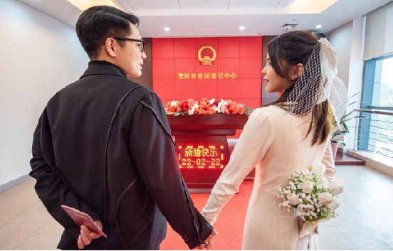 2022年2月22日,农历正月廿二,星期二,因为“2”谐音“爱”,这一天被网友们称作“最充满爱意的日子”。当天,市行政服务中心婚姻登记窗口迎来了“小高峰”,仅网上预约的就有77对。