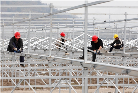 近日,坞根镇花坞溪区块红色研学奇趣农耕体验区,建设者在搭建农业玻璃温室顶棚斜梁。