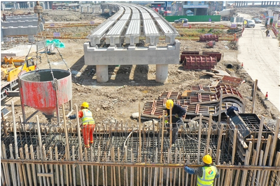3月9日,甬台温高速至沿海高速温岭联络线滨海枢纽,建设者正在浇筑盖梁。滨海枢纽是“两高”联络线控制性工程,目前已完成全部桩基施工,全面进入盖梁浇筑和桥板铺装。