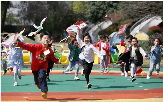 近日,温岭市中心幼儿园举行“放飞童心,拥抱春天”活动。通过做风筝、画风筝、放风筝,让孩子们感受春天美好的景象,放飞多彩的梦想,激发他们热爱生活、热爱大自然的情感。图为孩子们在现场尽情地放飞风筝。 记者 周学军摄