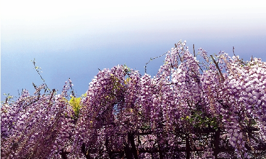 铅笔广场的龙爪槐像长满青色鳞片的龙爪子,也许这就是“龙爪槐”名字的由来吧!在紫藤花园,一片飘浮在半空中的“花海”便映入眼帘。没错,它就是大名鼎鼎的紫藤花。紫藤花接二连三地排列着,连成了一片花海、一片粉云。这一片片花海、一朵朵粉云,又宛如一串串晶莹剔透的宝石,散发着沁人心脾的香味。这香味没有百合那么浓郁,也不像牵牛花那么淡雅,香得恰到好处。别看它布满长廊顶部,听说都是来自于同一株,真是神奇。