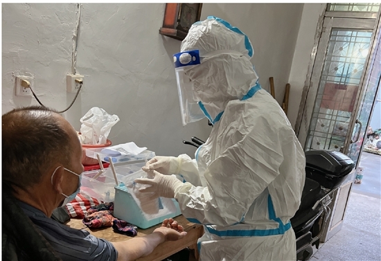 当天傍晚,鲍仙琴护士长和李晓婷护士驱车20公里赶往患者家中。她们穿上防护服,戴好面罩,一切准备就绪,便提着居家护理服务箱,上门为患者提供专业的PICC导管维护。
