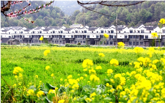 3月30日,城南镇叠岭村,白墙黛瓦的浙派民居与村前的河道、油菜花、塑料大棚等田园风光相映成趣,构成一幅色彩斑斓的美丽乡村生态画卷。