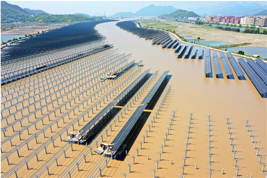 4月4日,江厦潮汐试验电站库区,为确保工程在5月底建成并实现全容量并网,建设者放弃小长假休息时间,加班加点在水上安装潮光互补智能光伏发电场太阳能板和支架。