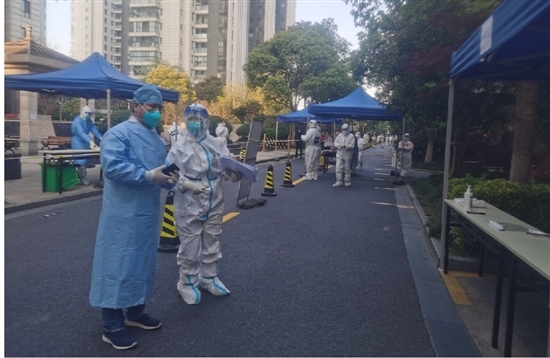 4月4日凌晨5点,队员们抵达上海,简单吃了早餐,立即穿上防护服、戴上口罩等,早上6点就准时出现在各个社区,有条不紊地开展采样工作。