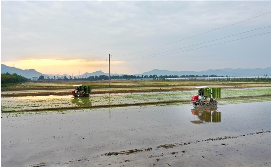 4月5日傍晚,箬横镇种粮大户组织人员机插早稻秧苗。当天,我市早熟早稻全面开插。
