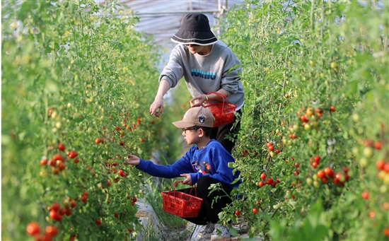 4月10日,游客正在新河镇老后生果园采摘小番茄。该镇农户于冬季种下的小番茄,眼下已开始采摘上市。由于小番茄玲珑可爱、营养丰富,深受消费者青睐。小番茄亩产可达2000公斤左右,农户收入可观。