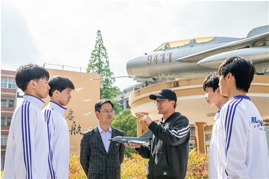 4月15日,在南京军区飞行员早期培训基地——箬横中学,老师手拿飞机模型向学生讲解战斗机的性能与作用,普及国家安全知识,增强学生的国防意识和观念,弘扬爱国主义精神。
