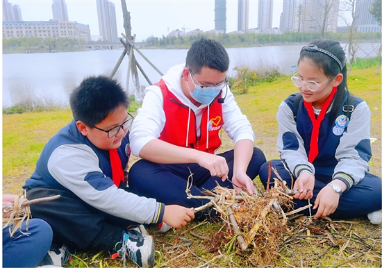 五(1)班的江珂昕在草坪上寻找具有柔韧性的树枝和常绿的枝叶,对比认识了许多植物,最后选择了藤草和干树枝。“制作鸟巢的过程,也是一个不断发现问题、解决问题的学习过程。”江珂昕说,这是一项非常有趣的手工活动,给了她与大自然亲密接触的机会。