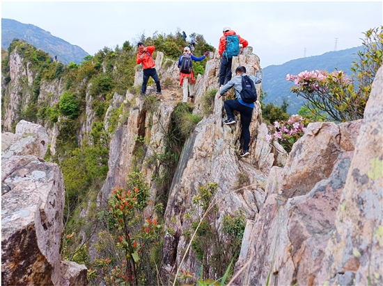 “骑马岭”是位于我市城南镇的一处自然景观,因过此地要像骑马一样通过而得名。“骑马岭”瘦石嶙峋,块块突兀,薄如刀片,有如剑直指蓝天,故又名“薄刀山”。近期,和“骑马岭”遥相呼应的温岭第二高峰斗米尖杜鹃花盛开,我市户外爱好者纷纷组队前往踏青赏花,感受“骑马岭”的惊险。