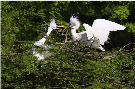 本报讯(记者陈祥胜/文 通讯员杨伟东/图)近日,有温岭鸟类摄影爱好者拍摄到了国家一级保护动物黄嘴白鹭求偶的罕见照片。
