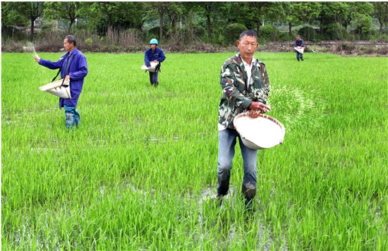 5月16日,箬横镇晋岙里村,种粮大户正组织民工追施早稻分蘖肥。