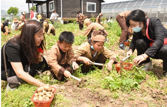 挖土豆、摘番茄、喂绵羊、亲手制作多彩蒸饭……近日,箬横镇党群服务中心和“乡村七巧板”爱心服务社联合举办“关爱外来务工子女 亲子体验农耕生活”活动,30多名箬横镇第四小学的外来务工人员子女和家长一起来到东浦农业观光园,体验接地气的农耕文化,感受田间劳作的快乐,共享浓情亲子时光。