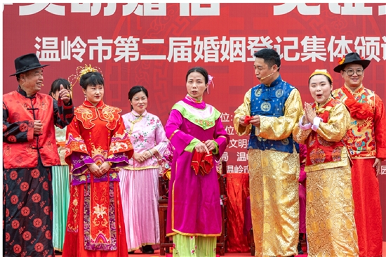 当天,小品《酒席》、特色节目《洞房经》等带有温岭特色的传统婚礼展示将活动推向了高潮。“我们将简单的结婚登记程序转变为更具仪式感的颁证仪式,让大家在庄严神圣的氛围中,感悟婚姻的责任与担当,进一步弘扬‘重登记、强责任、崇节俭’的婚俗新风。”市民政局相关负责人表示。