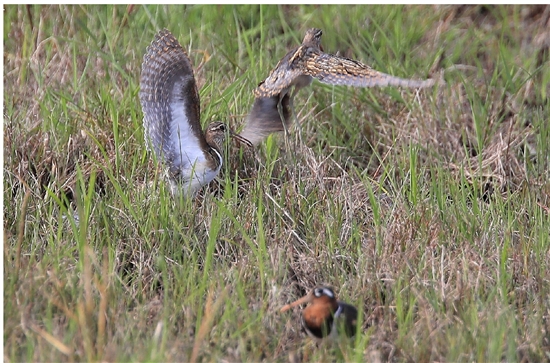 用喙啄,用爪子挠,挥动翅膀狂扇,还不时跳到对方背上来一招“泰山压顶”……只见草丛里,两只雄性彩鹬为争夺对雌性彩鹬的交配权,正斗得天昏地暗。一旁的雌性彩鹬则是冷眼旁观。