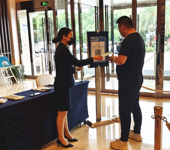 “您好,请戴好口罩,用支付宝扫一下‘台州码’。”端午小长假临近,我市的酒店服务人员除了做好防疫相关措施,还加强了对入住游客的文明引导和提醒。前台服务人员也增加了对游客在温岭文明旅游的相关注意事项告知,如“进入景区戴好口罩”“在室内请勿吸烟”等文明提示,营造文明旅游浓厚氛围。 记者 王萍摄