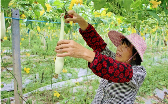 眼下,箬横镇的白丝瓜进入成熟上市期。得益于良好的气温环境,今年白丝瓜长势比往年来得好,预计产量超100万斤。6月8日,在该镇娄江村一白丝瓜种植基地内,菜农们正用剪刀把一根根悬挂在枝丫上的鲜嫩白丝瓜采摘下来。种植户蔡正伟介绍,今年他的18亩丝瓜上市比往年早十来天,一上市就被抢购一空,预计利润约20万元。从目前长势来看,丝瓜可一直采摘至7月初。