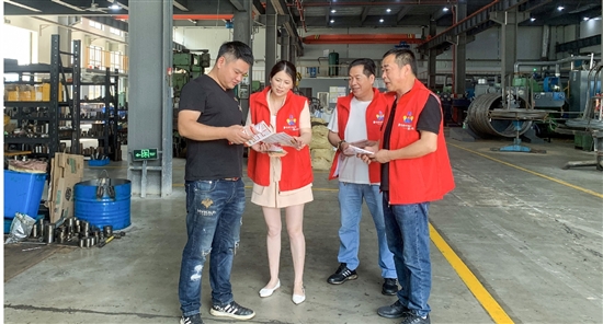 图为该村党建网格员走进水岸工业区,面向企业主要负责人进行安全宣传教育,督促他们遵守安全生产法、当好“第一责任人”。
