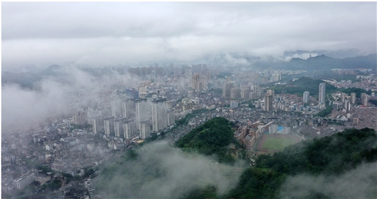 连日雨天暂时停歇,三面青山簇拥的温岭市区水汽蒸腾,形成袅袅云雾,萦绕于城市之上,飘荡于山峦之间,犹如一幅天绘地描的水墨丹青,无边无际,美不胜收。