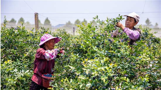 本报讯(记者赵碧莹/文 徐伟杰/图)“现在蓝莓都开始成熟了,我在这里一天能摘上百斤。一天有120元的收入,整个蓝莓季能赚五六千元。”日前,在新河镇下章假日田园蓝莓基地里,69岁的阿婆腰间挎着篮子,穿梭在蓝莓树下,一边摘着枝头一颗颗蓝紫色的果子,一边笑着和记者说道。