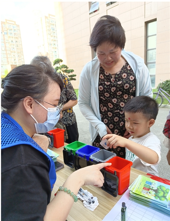 在社区志愿者的热情讲解下,不少业主跃跃欲试。“苹果扔到哪个垃圾桶?”“炉渣算哪一种垃圾?”“花朵属于什么类别的垃圾?”领到小卡片,参与活动的业主们认真地进行投放。有遇到不确定如何投放的,旁边的业主们还会争着提醒,大家参与热情高涨。社区志愿者也适时地拿出《生活垃圾投放指南》,通过里面明确的分类方法,指导业主正确投放。