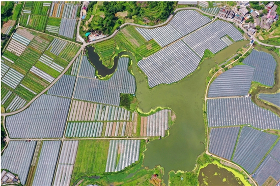 7月3日,无人机镜头下,温峤镇金岩村,连片葡萄大棚,将田间装扮成一幅亮丽画卷。