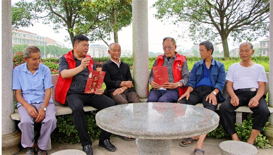 图为在箬横镇严家桥村,村红白理事会理事长叶学利通过身边事向村民们讲解了婚丧礼俗整治有关政策知识,引导大家主动遵守村规民约,参与到破除陈规陋习的行动中来。