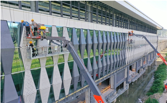7月6日,台州市域铁路S1线温岭段城南站,建设者在安装车站外墙装饰板。