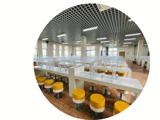 在紫荆校区的蓝玉餐厅,记者看到,食堂宽敞明亮,白色的石英台餐桌上放着透明挡板,明黄色的小圆凳整齐划一,白色的墙壁上张贴着色彩鲜明的食育画册,看上去简洁温馨。