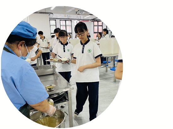 在食堂的管理上,学校规定了食品卫生“五四”制,包括由原料到成品实行“四不”制度、成品存放实行“四隔离”、用(食)具实行“四过关”、环境卫生采取“四定”办法、个人卫生做到“四勤”,规范食品操作的每一步骤。此外,学校还成立了膳食管理委员会,让学生代表、家长代表、教师代表、学校工会代表、学校党支部纪检人员等一起守护学生舌尖上的安全和健康。