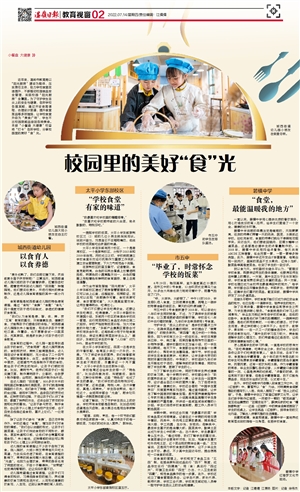 为了了解学生的口味,同时引导学生养成健康的饮食习惯,每个学期开学初,学校都会举办“我的营养我做主”菜谱设计大赛,让学生当一回营养师,设计适合自己口味的营养大餐。为了促进学生科学饮食、健康成长,学校还会借助“中国学生营养日”开展营养周系列活动,通过宣传画报,让学生了解中国居民的膳食宝塔;邀市营养健康指导中心专家开展主题讲座,介绍高油高盐高糖对学生身体健康的严重危害,并讲述一些减盐减油减糖的小妙招。学生们走进学校食堂后厨,跟工作人员学习甄选蔬菜……