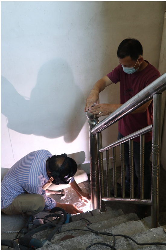 7月7日,毛道国一行带着铝合金楼梯扶手来到了周孔荣家中。楼道闷热,不一会儿,他们的衣衫便湿透了。得知周孔荣家楼顶没有门,考虑到夏天是台风季,毛道国等好心人表示近期会帮他装好。