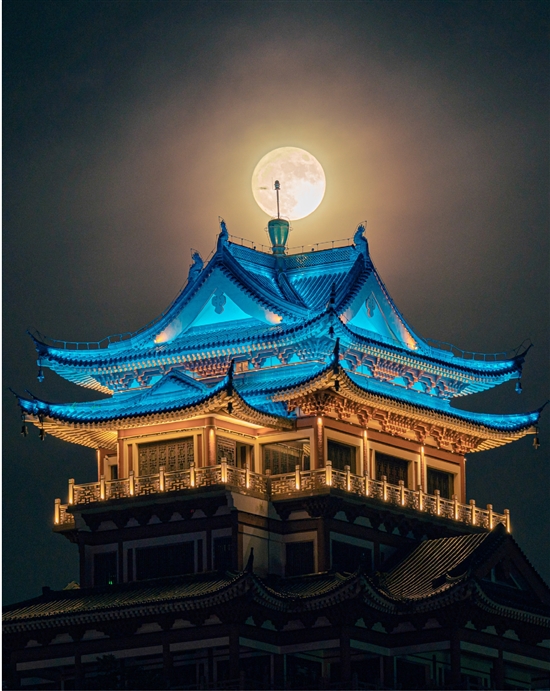 7月13日晚,“超级月亮”现身温岭上空。继6月14日之后,“超级月亮”又一次现身天宇,且本次“超级月亮”是今年诸多满月当中最大的一个。天文预报显示:7月13日17时06分,月球过近地点,是一年中距离地球最近的时刻,视直径自然最大;7月14日2时38分为“望(满月)”,此时月亮“最圆”。“超级月亮”也称“近地点满月”,此时,月亮又大又圆,吸引人们观测。图为“超级月亮”经过东辉阁上空。