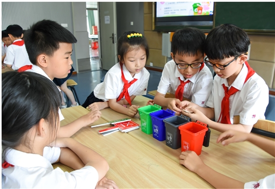 依照安排,浙江省“最美环保人”黄小灵等6名教师将在九龙学校、泽国镇第二中学、泽国镇第四中学、石桥头镇中学、新河镇长屿小学等5所学校开展环境教育进课堂活动,进一步提升广大青少年学生的生态环境保护意识,广泛普及生态文明理念。图为在九龙学校的活动现场,学生们通过趣味游戏了解生活垃圾分类知识。