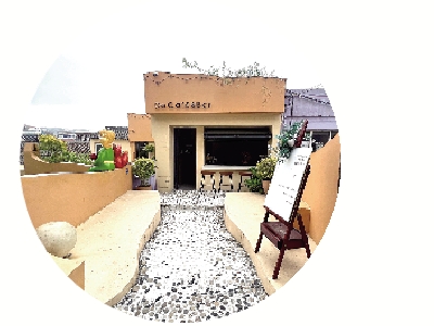咖啡馆位于半山腰的主干道旁,是两间民房的顶楼。屋前朝海,屋后临山,咖啡馆的门口是顶楼的后门,连着半山腰的路。