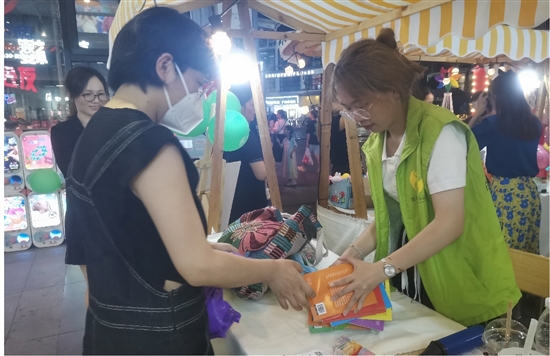 向过往市民发放宣传单,宣传“爱心图书角”系列公益项目,钟亦然忙得不亦乐乎。这不是她第一次参与,往年,她帮着妈妈一起收集闲置的图书,自己也会主动捐书。