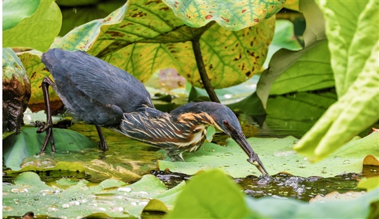 在某校园的一处荷花池内,黑苇鳽站在一片荷叶上,不时观察着水下的动静,纹丝不动。发现有鱼靠近后,黑苇鳽瞅准时机,闪电般一头扎进水里,随后用嘴叼上来一条小鱼。将鱼叼离水面后,它缓了缓神,将小鱼囫囵吞进肚中。