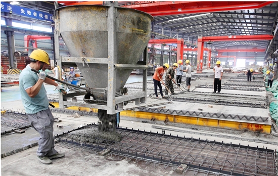 7月21日,市气象台发布高温红色预警,我市多地最高气温达40℃以上,工程建筑等许多户外作业不得不错时进行。而曙光装配式建筑科技(浙江)有限公司的工人们却能避免阳光直射,在吹着风扇的高大厂房里浇筑预制叠合板构件。