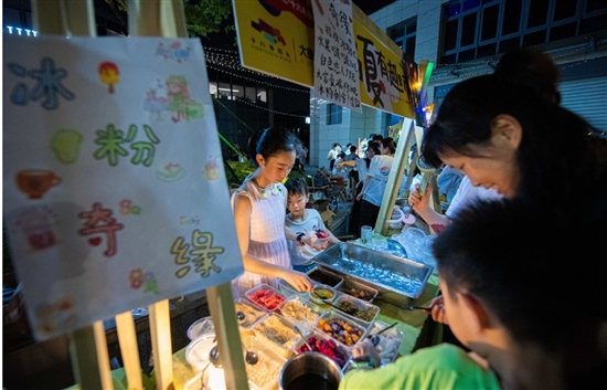 这个专属于“青烛”实践队的夜市分为三大区域,共有6个摊位。美食区里,喷香的茶叶蛋,晶莹剔透的冰粉,冒着凉意的水果捞,大小“吃货”排队吃喝不停。手工艺作品区,灯火摇曳下,创意十足的文具盒、发夹,也为夜市增添了一抹亮色。还有旧物售卖区,人气颇高。